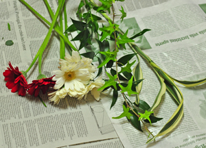 本日の花材です。 左から、ガーベラ赤 2本 ガーベラ白 5本 アイビー 1本(今回は使いませんでした) ルスカス 1本> サンデリアーニ 1本 以上です。 |