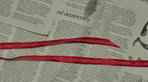 リボンを1メートルぐらい用意します。 今回はオーガンジーの細い赤のリボンにしました |