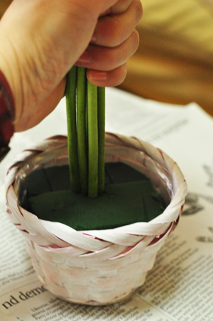 スポンジの真ん中にまとめて挿します。 ぐっと深めに3センチぐらい挿しましょう。 |