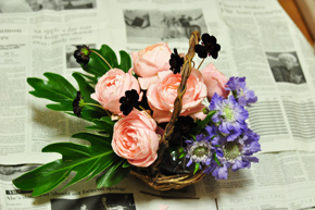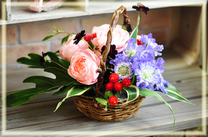 完成です(^^) バスケットを使うと、それだけでナチュラルテイストのアレンジメントになりますが、花をバラバラにミックスしてアレンジするより、ある程度グルーピングすることでまとまりが出来てより自然な感じになりますよ(^^)