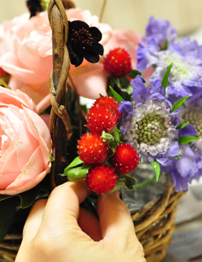 こちらもバラとスカビオサの間の空いたところにまとめて挿します。 真っ赤で丸くて、かわいいです |