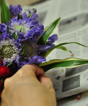 つづいてその右どなりのスペースにスカビオサを挿します。 これもまとめる感じで。 少し高低差をつけて立体感を出します。 |