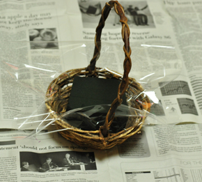このようなカゴの場合は、水がもれますのでセロファンをしっかりと敷いてください。 吸水スポンジをカットしてセットします。 セロファンの無駄な部分はハサミで切り取ります。 少し低めにカットしてください。