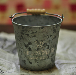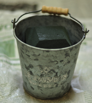 花器はこのようなブリキのバケツのようなものを使いました。 実際のバケツではなく、雑貨屋さんなどにあるかわいいサイズの小さいものです。 水が心配な場合はセロファンを敷いてください。