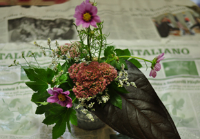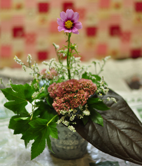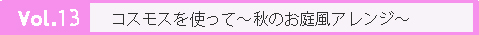 | 秋も深まり、コスモスがお庭や野原に咲いていることでしょう。 自然に咲いているコスモスは、細い茎でしなやかに風に揺れていますね。そんな風なイメージで、お庭の一場面を切り取ったようなアレンジメントを創りたいと思います。秋ならではのナチュラルアレンジメントです。 |