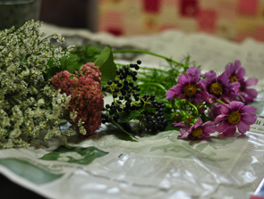 スターチスを小枝にわけて、隙間に挿していきます。 長いものや短いものを混ぜながらランダムに挿します。 よりナチュラルに見えるように。