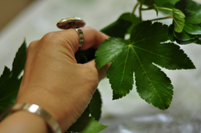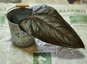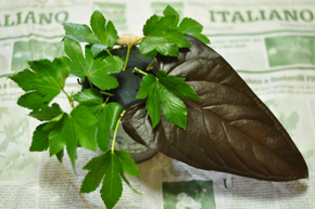 まず、アンスリウムの葉を挿します。 とても大きな葉っぱなので、1枚だけでインパクト大! 見せるように、効果的に使います。 |