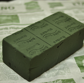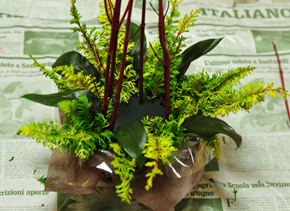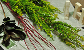黄金ヒバです。 このぐらいの小枝に切り分けて、スポンジを隠すように挿していきます。 長いのや短いのがあっても大丈夫ですので、どんどんさしていきましょう。 |