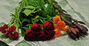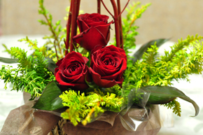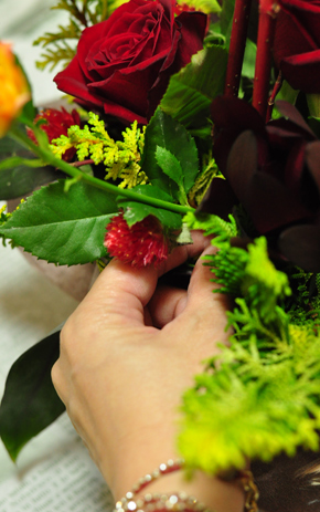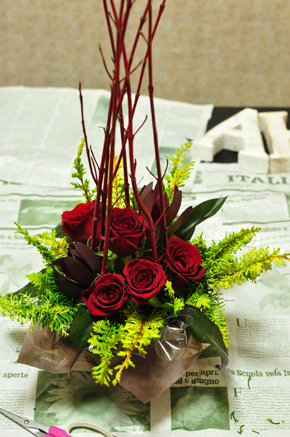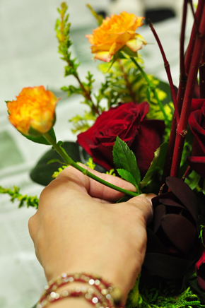 バラを真ん中とそのまわりに挿していきます。 短くさしますが、少し高低差をつけて挿しましょう。 |