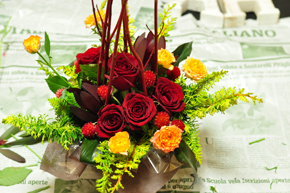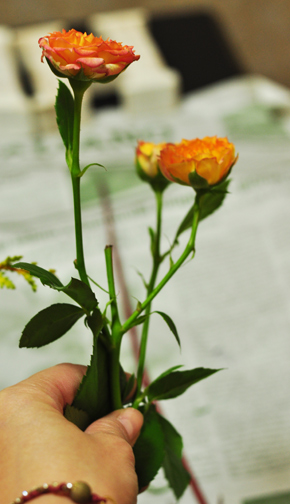 オレンジ色のスプレーバラ。 黄色でもOKですが、ちょっと渋いオレンジのバラがあったのでそちらを選びました。 スプレーバラは、枝を何本かに切り分けて、ランダムに挿していきます。 少し長いものがあればそのまま挿して動きをつけます。 |