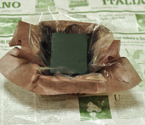 吸水したら、セロファンと茶色の包装紙を重ねて包みます。 器にセットしてセロファンなどの余分な部分はカットしてください。 水が外に漏れないようにきっちりセットします。