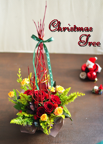 | 花や葉だけでツリー状にするとたくさん花材がいりますしたいへんですが、サンゴミズキだけでこんな風につくればとても簡単お手軽なXmasツリーが完成します。 バラはそのままドライになっても色があせにくいですし、ヒバはとっても長い間きれいな色でいてくれますので、結構長く楽しめるアレンジです。 |