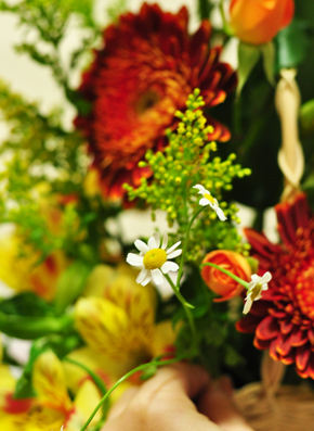 マトリカリアは小さくてかわいいお花ですがアレンジのとてもいいアクセントになるので、飛び出すような感じであいているところに数本挿します。 短めに挿しました。
