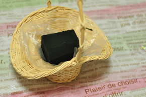 吸水スポンジをカットして器にセットします。 スポンジをビニール袋で覆うか、セロファンを下にひいておきます。