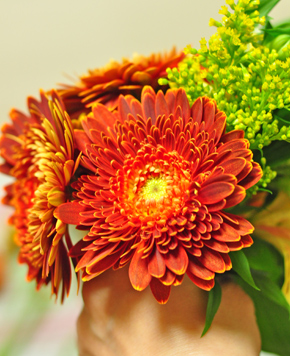ソリダコは、小枝に切り分けてアルストロメリアとガーベラの間を埋めます。