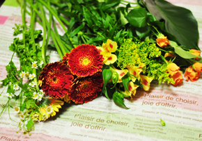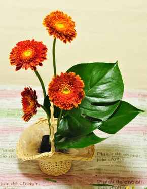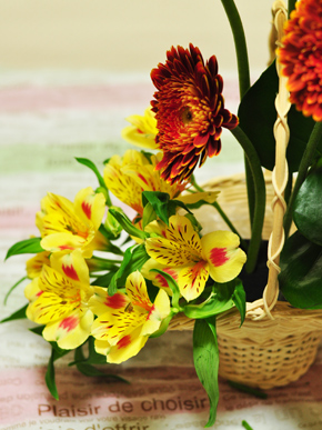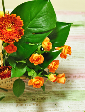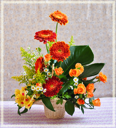 | オレンジや黄色など、ビタミンカラーといわれる柑橘系の色は見ているだけでも元気が出ますね☆ ナチュラルなバスケット花器はラフにアレンジすることが多いのですが、今回は花をグルーピングしながら、ちょっとおしゃれにアレンジしてみましょう。 |