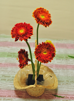 ガーベラを、高さを違えて5本挿しました。 ガーベラの大きさにもよりますが、小さいものならもう少し低く、小さめのアレンジにします。 それぞれの花の顔が見えるように挿してください。 |