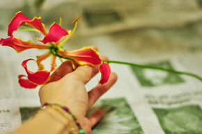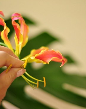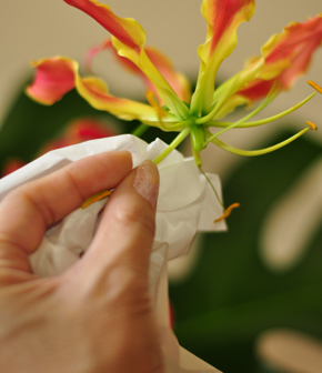 余談ですが、 グロリオサのようなユリ科の花は、花粉がとても散りやすく、服や手にもついてしまいますので、できればとってしまいましょう。
