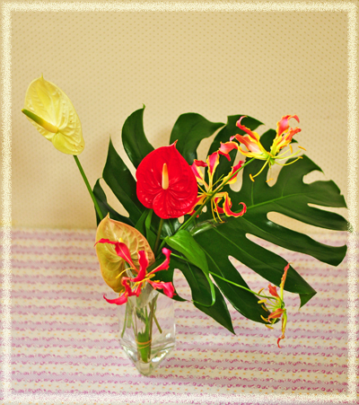 右から モンステラ 1本 グロリオサリリー 1本 アンスリウム 3本 |