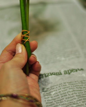 グロリオサは枝わかれしているので、 何本かにわけます。 短いものは下のほうにつかいます。 |