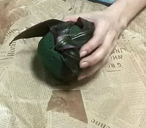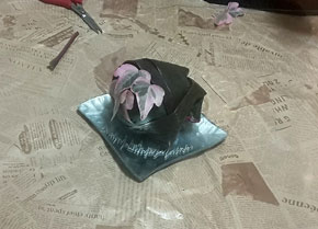ドラセナの葉を2~3枚、スポンジの半分を覆います。 裏でUピンでとめて固定します。 |