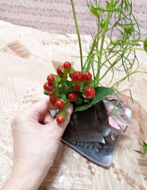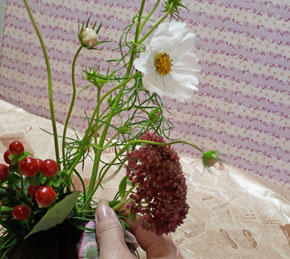 コスモスをアレンジします。 少ない本数でも最低3本あればバランスよくアレンジすることができます。 |