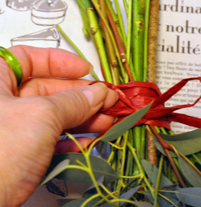 その上からもう一度ラフィアで輪ゴムを隠すように縛ります。