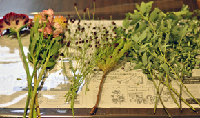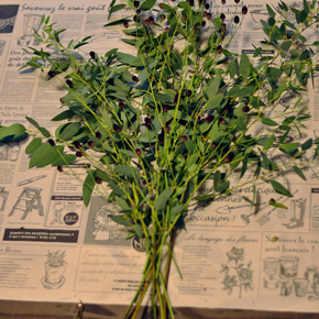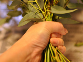 それぞれの花材の枝を分けます。 束ねる下の部分の葉っぱは取り除いておきます。 |