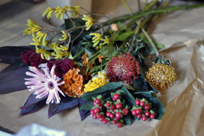 花材です。 ドラセナ・カンガルーポー・バラ・ピンクッション・ケイトウ・ヒペリカム・ガーベラ 秋の花材を選びました |