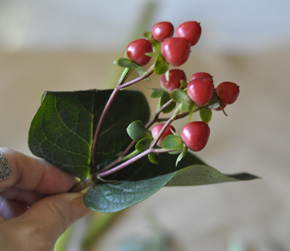 ヒペリカムです。 ヒペリカムは色んな色がありますが、今回は赤い実を使います。 小枝に分けて、まとめて挿しましょう。