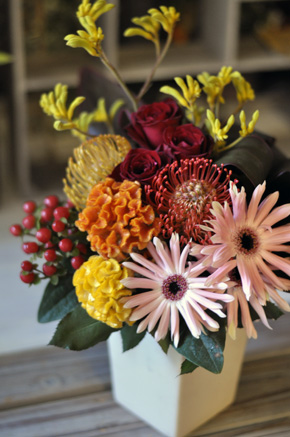 秋の花材の深く重厚な色合いで深まる季節を表現します。特徴的な形をしたお花も多く、この季節ならではのアレンジメントを楽しみましょう |