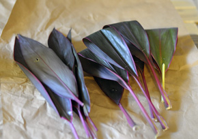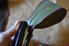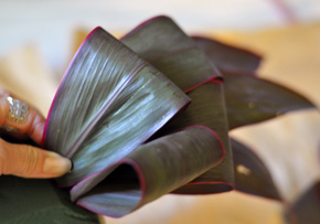 ドラセナは1枚ずつに分けて、半分をループ状にしていきます。 ホチキスで葉脈に垂直にとめましょう