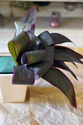 グルーピングでアレンジするので、重なるように集めて挿していきます。 リボンのように立体的に、長いものを下にループのものは上に重ねます。 |
