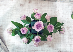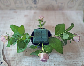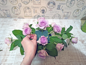 ワックスフラワーは小枝にわけ、バラとバラの間を埋めていきます |